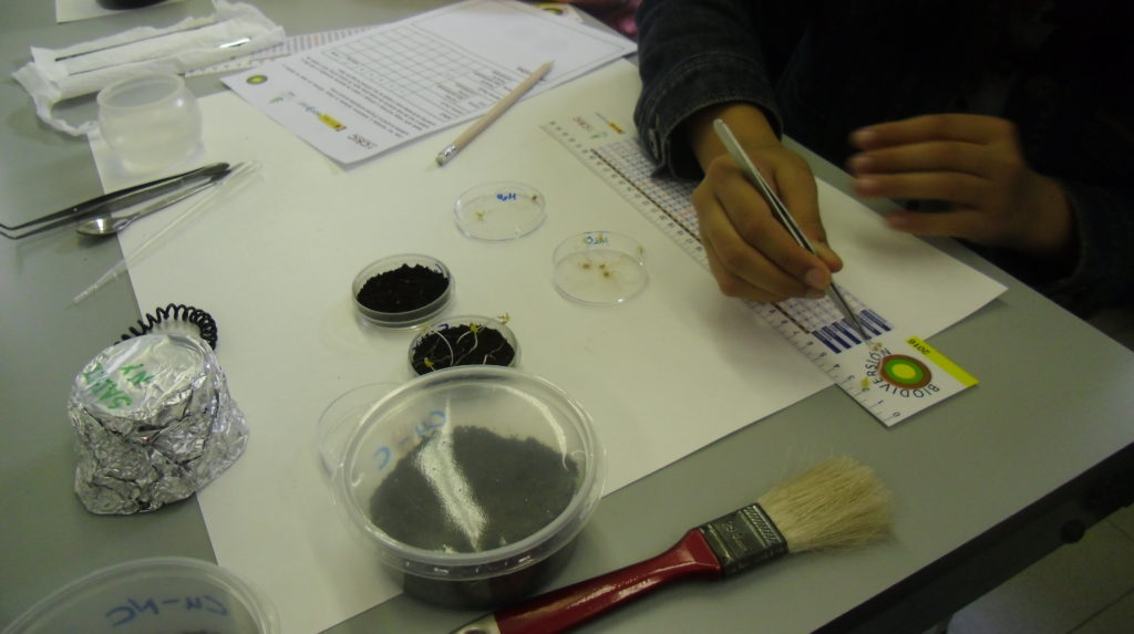 In a second workshop, using a phytotoxicity test, the toxic effects of certain compounds on the germination, development and growth of watercress seed (Lepidium sativum L.), the species most commonly used in this type of studies, was evaluated. For this, watercress seeds are sown in different types of soil that are weighed by the students and placed in Petri dishes. Once germinated (it takes four days for them to germinate, so the class monitors have material prepared in advance) the differences in seed growth between contaminated soils and uncontaminated soils (measurements taken with ruler) are compared.